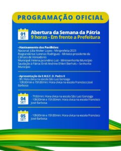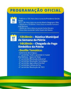 Durante a Semana da Pátria estão previstos momentos cívicos nas escolas municipais. A rústica municipal, que ocorre no dia 7, abre o feriado e a chegada do Fogo Simbólico, no início da tarde, marca o início do cerimônia de encerramento.