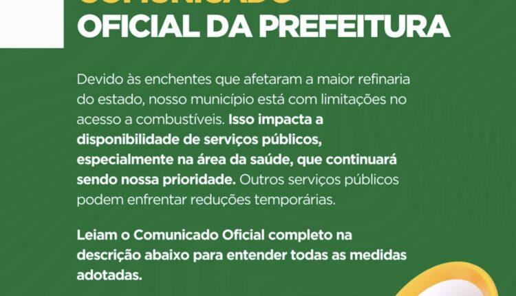 “Informamos à população que, devido às recentes enchentes que afetaram a maior refinaria do estado, localizada na região metropolitana, estamos enfrentando limitações no acesso a combustíveis. Essa situação impacta diretamente a operacionalidade dos serviços públicos em nossa cidade.