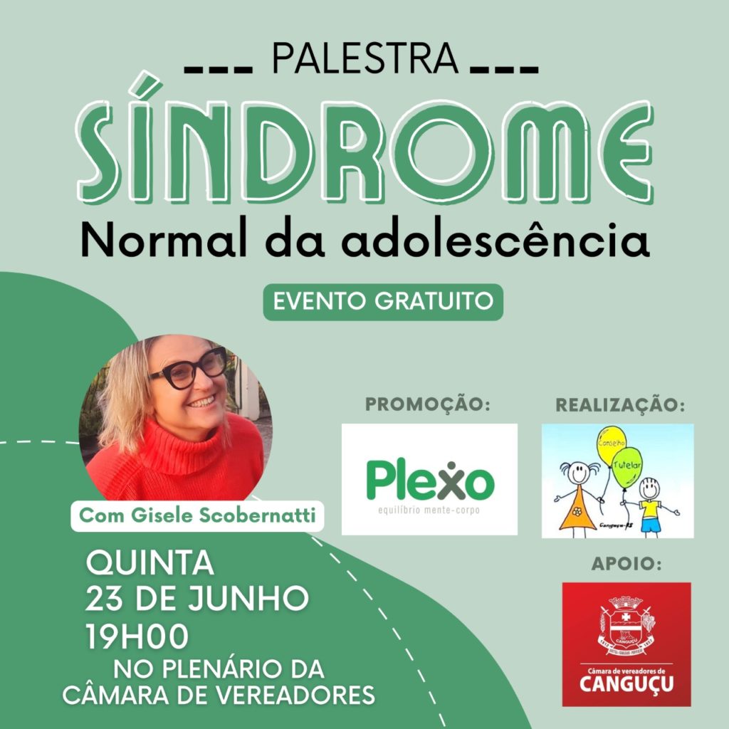 A psicóloga Gisele Scobernatti fará um palestra gratuita sobre Síndrome Normal da Adolescência na próxima quinta (23), na Câmara Municipal de Vereadores de Canguçu. Conforme anúncio, o momento será de bate-papo e diálogo, a partir das 19h. Quem tiver interesse, poderá se deslocar até o local para acompanhar o encontro.