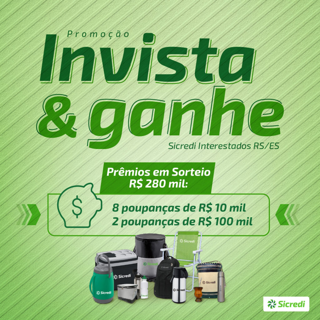 A cooperativa Sicredi Interestados RS/ES lançou no mês de maio a Campanha Invista e Ganhe, que vai sortear 280 mil em poupança, divididos em 8 sorteios de 10mil e 2 sorteios de 100mil, para associados que realizarem operações em produtos de investimento como Aplicação, Letra de Crédito do Agronegócio e Poupança. Além dos números da sorte os associados também recebem raspadinhas, são mais de 15 brindes diferentes.