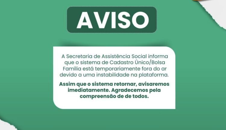 A Secretaria de Assistência Social informou, na manhã desta segunda-feira (4), que o sistema de Cadastro Único/Bolsa Família está temporariamente fora do ar.