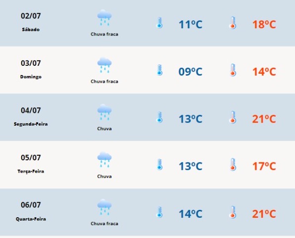 O clima ensolarado ficou pra trás na última sexta-feira (1°) e agora as chuvas devem tomar conta de todo o final de semana. As chuvas também permanecem ao longo dos próximos dias. Com previsão de leve queda de temperaturas, o tempo abafado pode ainda se manter durante a semana, com máximas de 21°C na segunda (4) e na quarta (6).