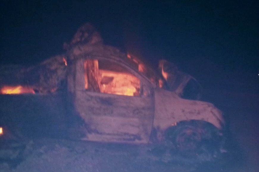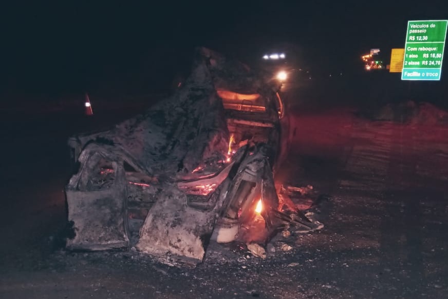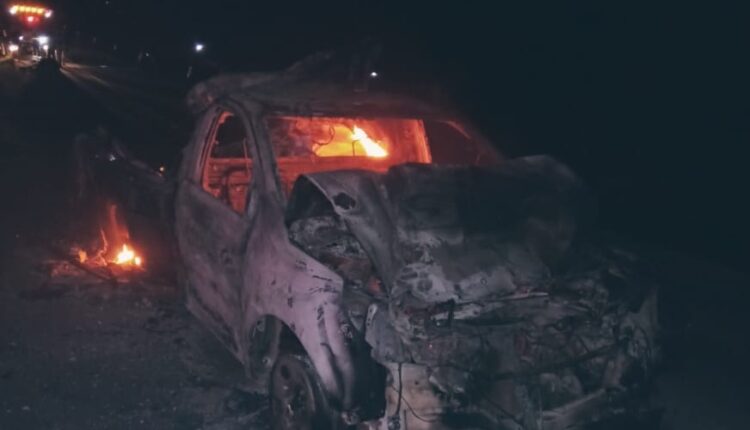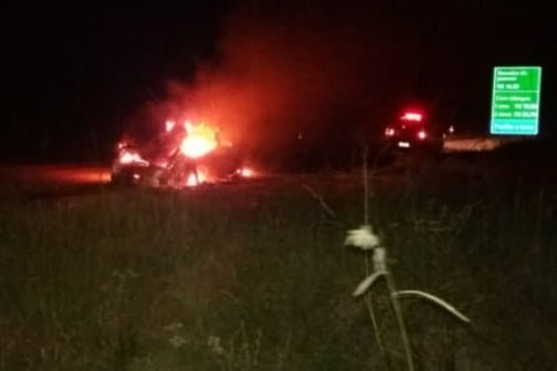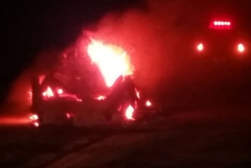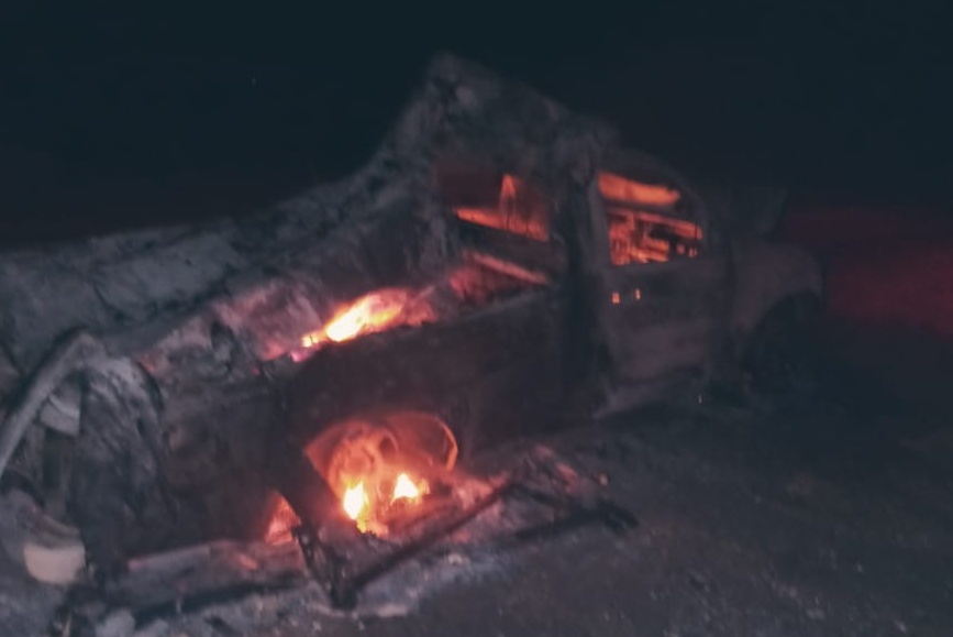 Veja o que restou da ambulância, uma Chevrolet S-10 após incendiar ao colidir com um animal solto na BR-392: