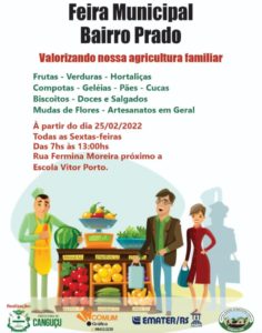 A Prefeitura junto da Secretaria de Agricultura, Pecuária e Cooperativismo estará realizando a inauguração da nova Feira do Bairro Prado, na próxima sexta-feira (25). A comercialização será na rua Firmina Moreira, próximo à escola Vitor Marques Porto. Os alimentos da feira são produzido pelos agricultores do município.