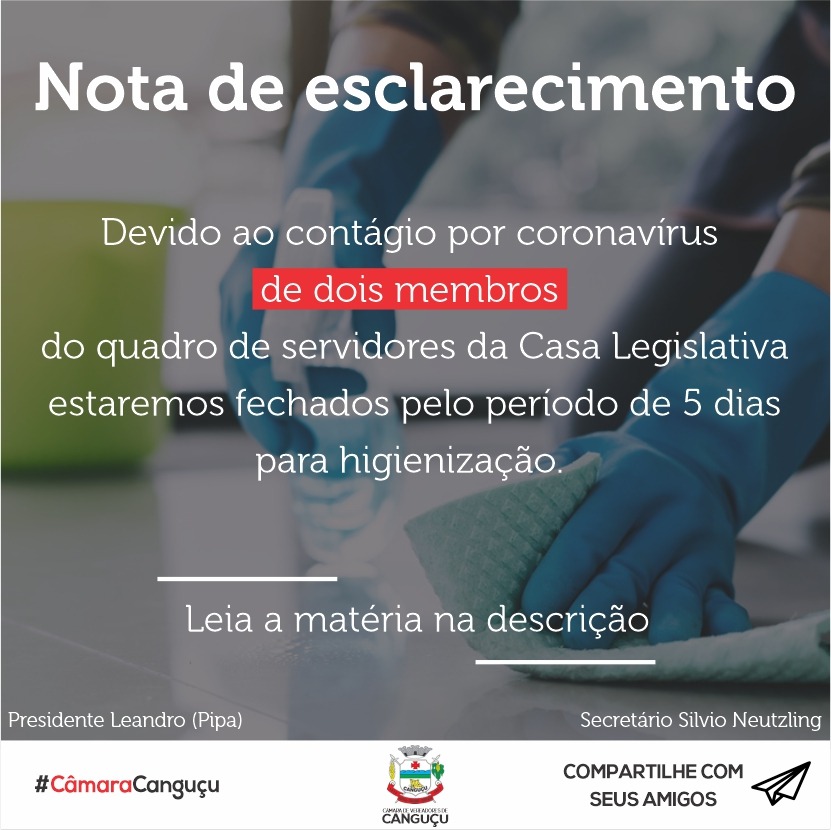 A Câmara Municipal de Vereadores de Canguçu, em conformidade com o decreto nº 1191/2021, informou que devido ao contágio por coronavírus de membros do quadro de servidores da Casa Legislativa, nesse momento estará realizando uma higienização nas dependências do prédio.