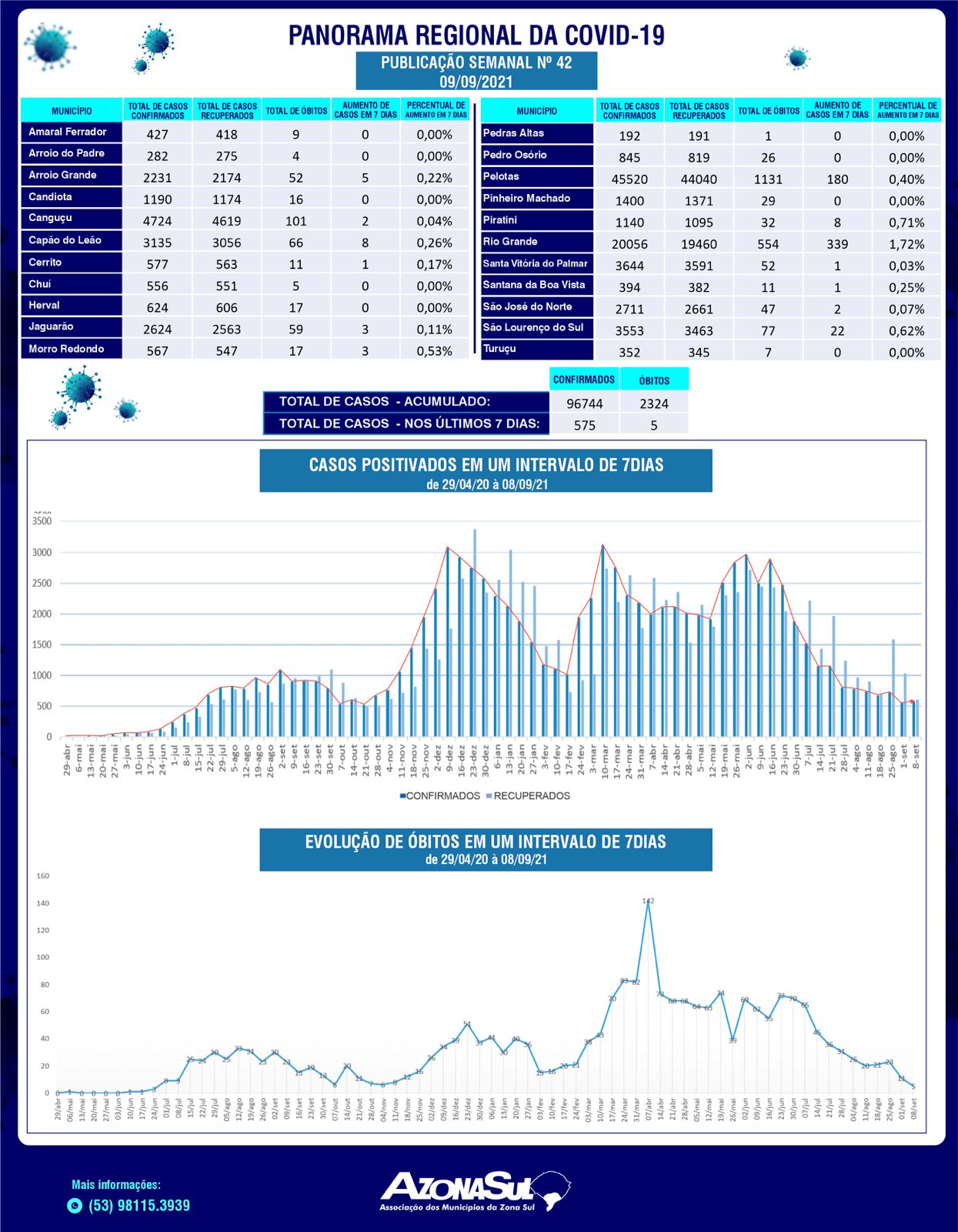 Nesta quinta-feira (9), um novo panorama semanal da covid-19 foi divulgado pela Associação dos Municípios da Zona Sul (Azonasul). Foram 575 novos casos na região nos últimos sete dias. Sendo que Rio Grande possui o percentual mais alto de contaminação (1,72%) e também tem o maior número de novos, 339 no total.