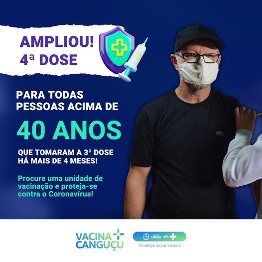 A Secretaria de Saúde informou, na última quinta (30), que a 4ª dose da vacina contra a covid-19 já está disponível para adultos com 40 anos ou mais, em Canguçu. Poderão receber o imunizante quem realizou a 3ª dose há 4 meses ou mais. Para isso, é preciso comparecer em uma unidade de saúde da cidade ou do interior.