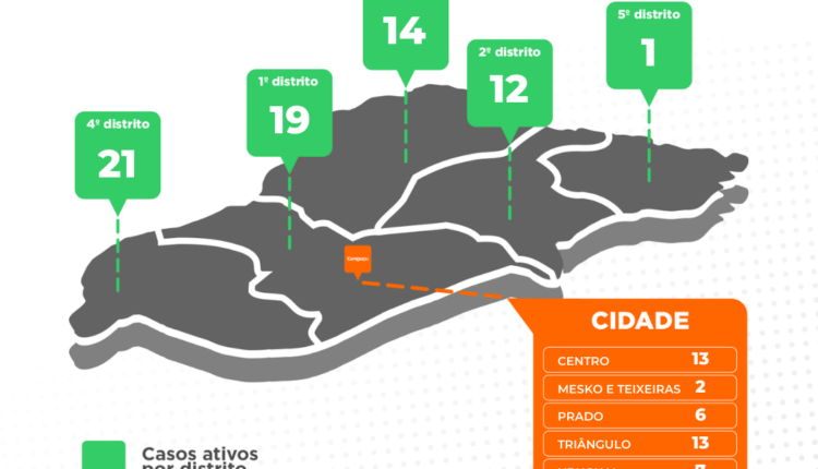 Ao todo, são 128 pessoas contaminadas por covid-19, nesse momento. Confira os casos por região do município: