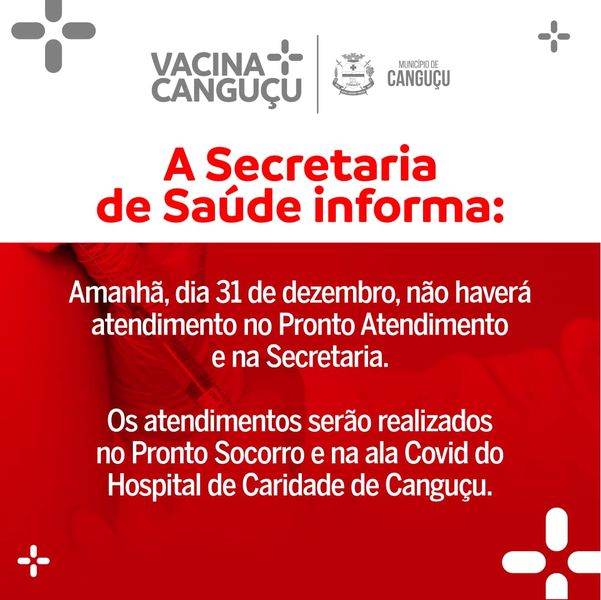 A Secretaria de Saúde informa que nesta sexta-feira (31) não haverá atendimento no Pronto Atendimento e na Secretaria. Os atendimentos serão realizados no Pronto Socorro e na ala Covid do Hospital de Caridade de Canguçu (HCC). Vacinação A vacinação também não será realizada tanto na cidade quanto na zona rural do município. Neste momento, a imunização está […]