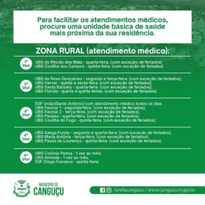Os demais atendimentos continuarão acontecendo nas unidades de saúde, ESF Triângulo, ESF Vila Nova e ESF Vila Fonseca. Além disso, confira a lista de locais de atendimento no interior do município.