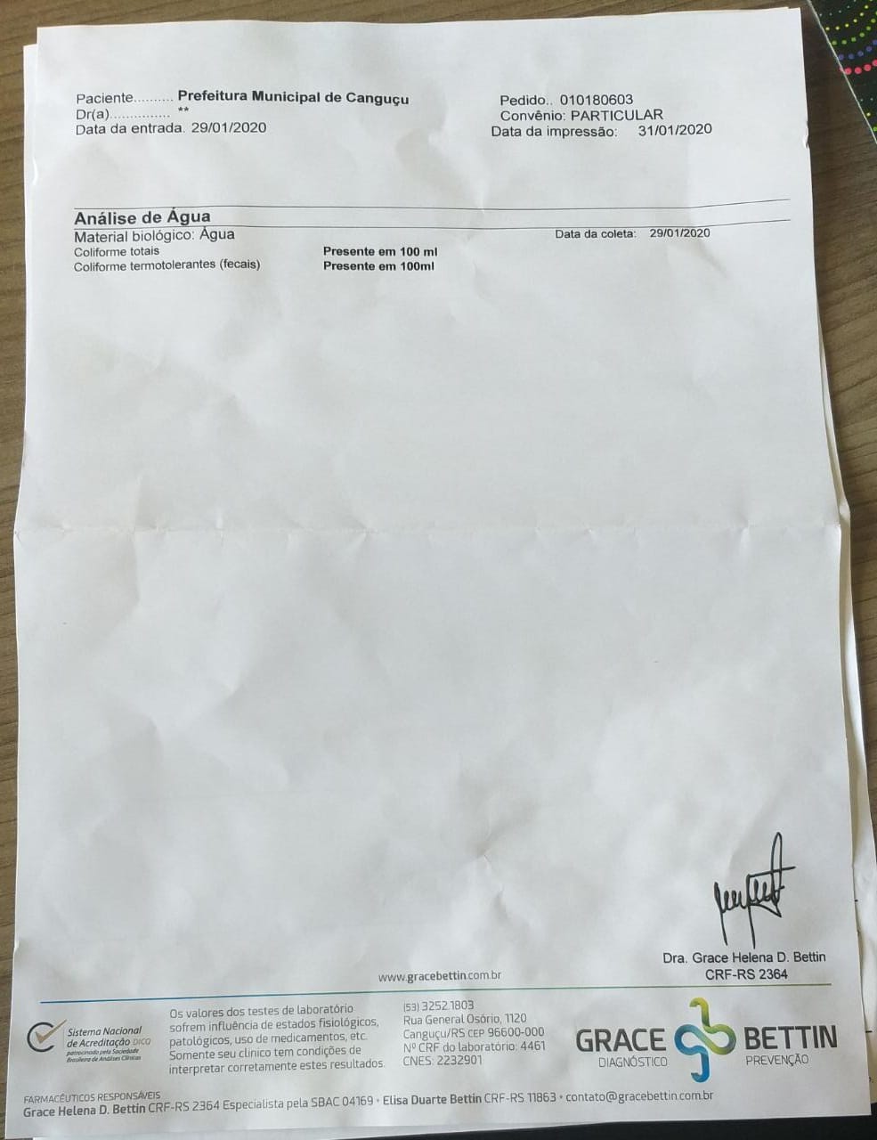 Confira abaixo o laudo da análise solicitado pela Prefeitura Municipal de Canguçu