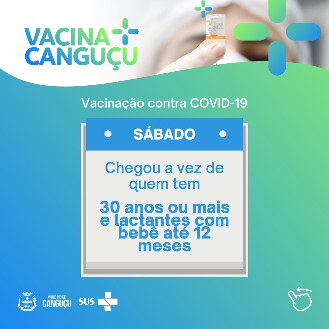 No próximo sábado (17), Canguçu avança a imunização para pessoas com 30 anos ou mais e lactantes com bebê até 12 meses poderão receber a 1ª dose da vacina contra a covid-19. O local será o Ginásio Municipal de Esportes.