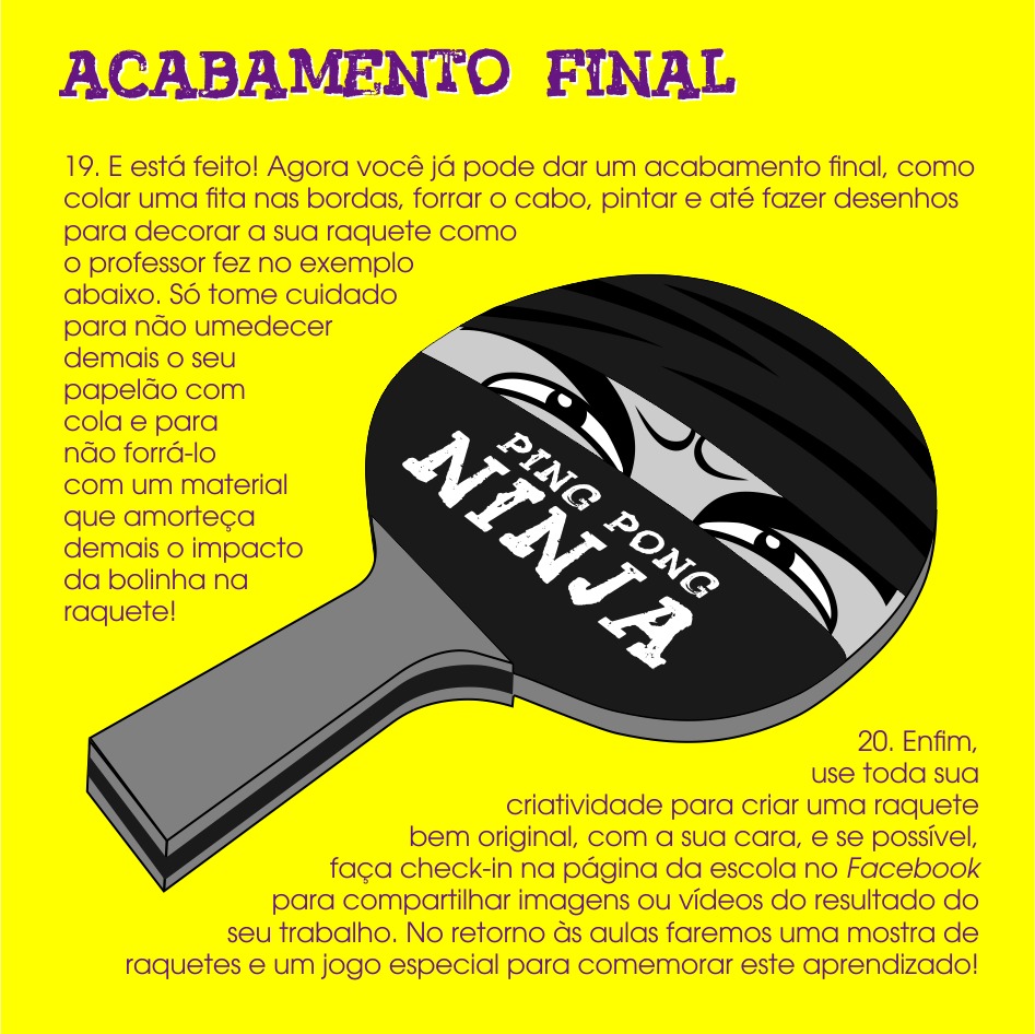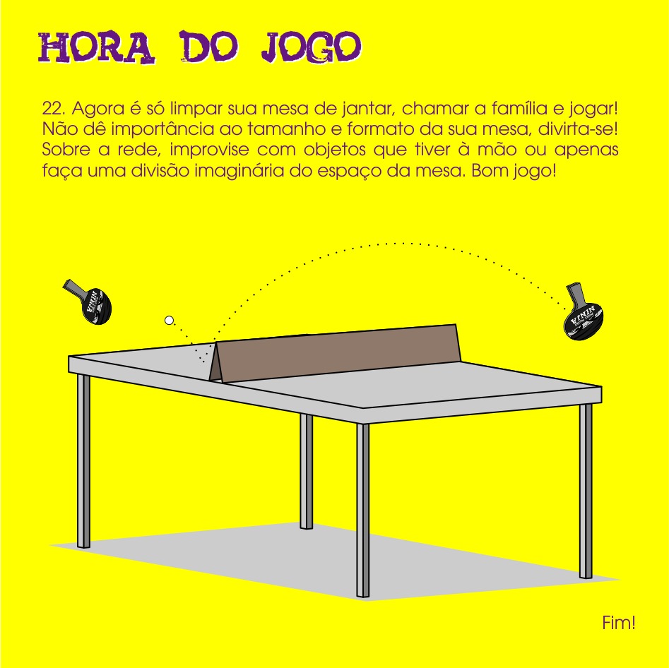Nós lançamos um projeto para incentivar a prática do tênis de mesa em casa com a família. Para não gastar com a compra de material, nós ensinamos a adaptar o que tiverem em casa e a fazer as raquetes com material alternativo ou reciclado.