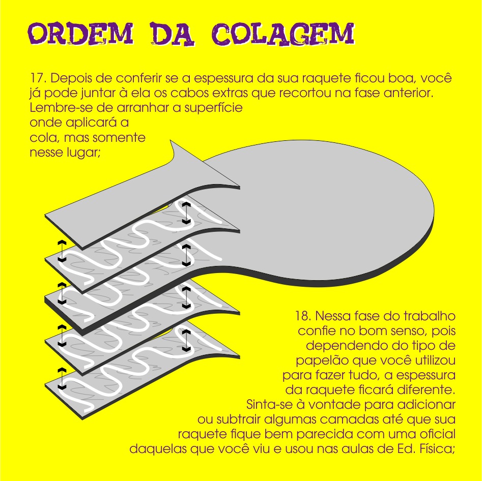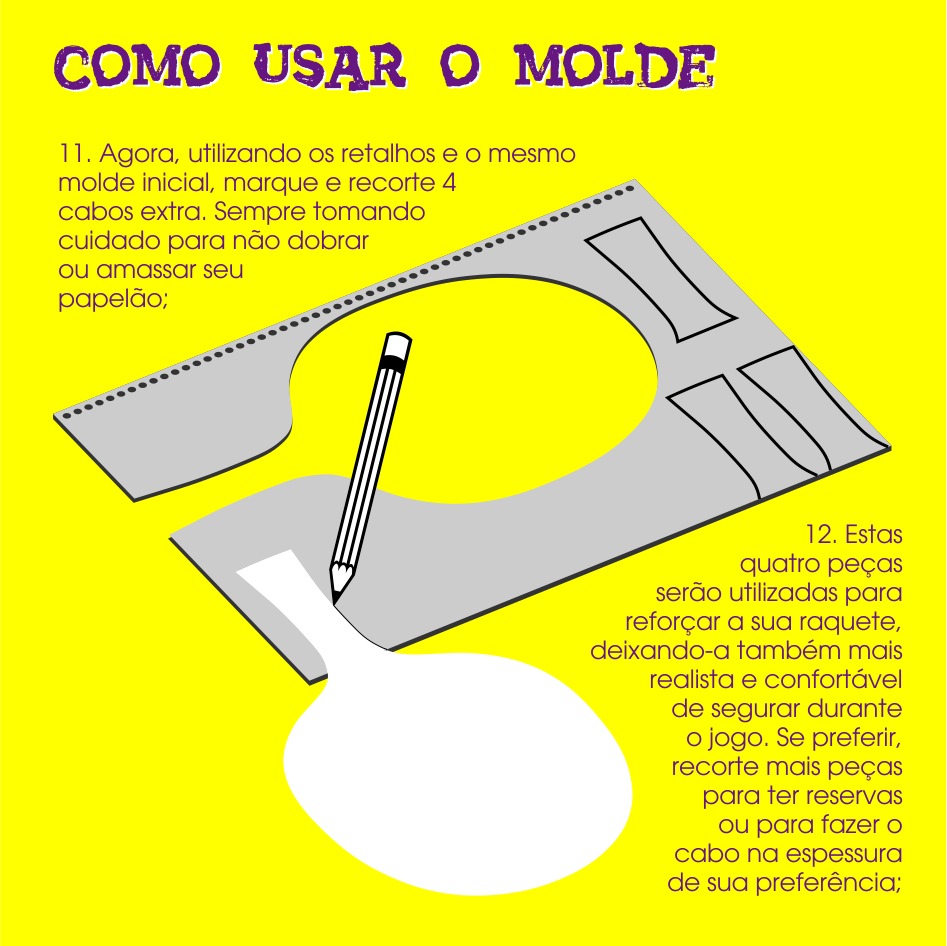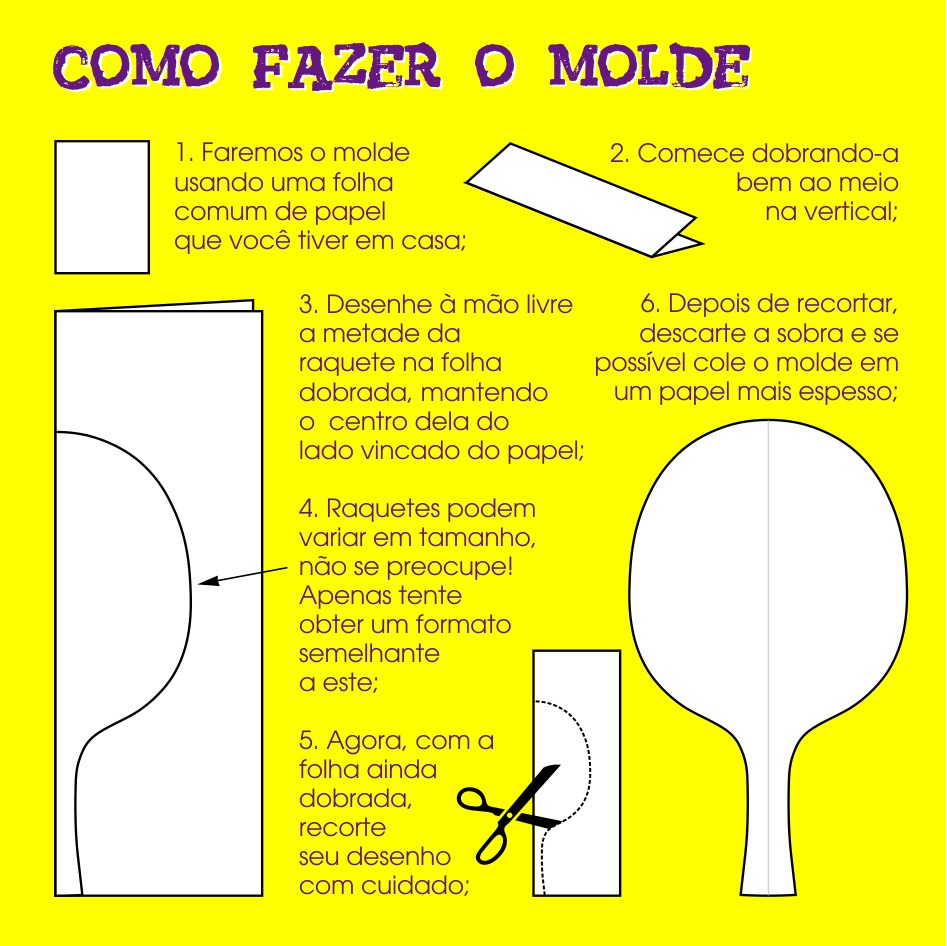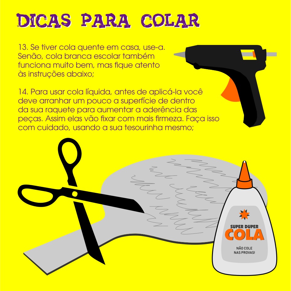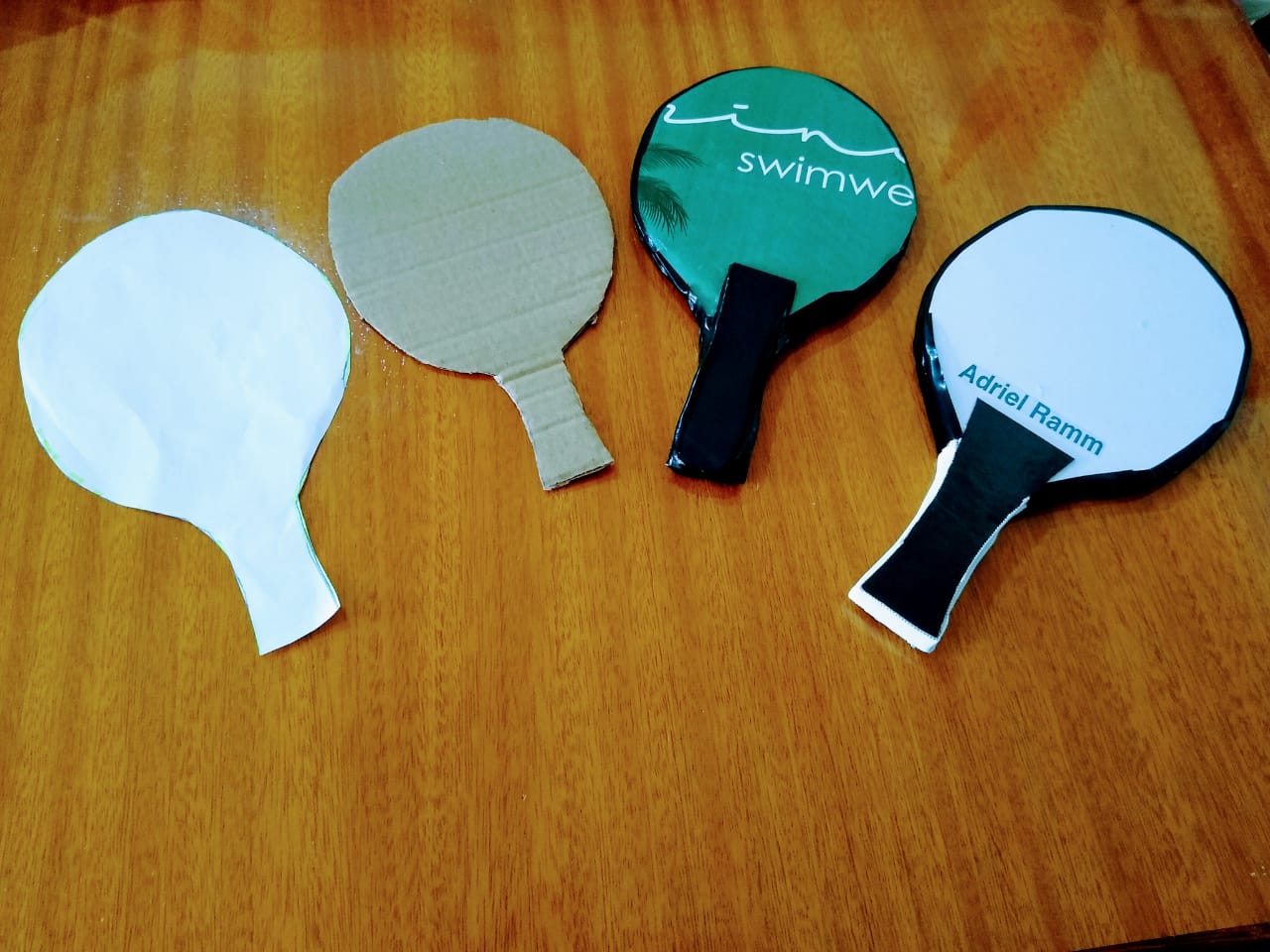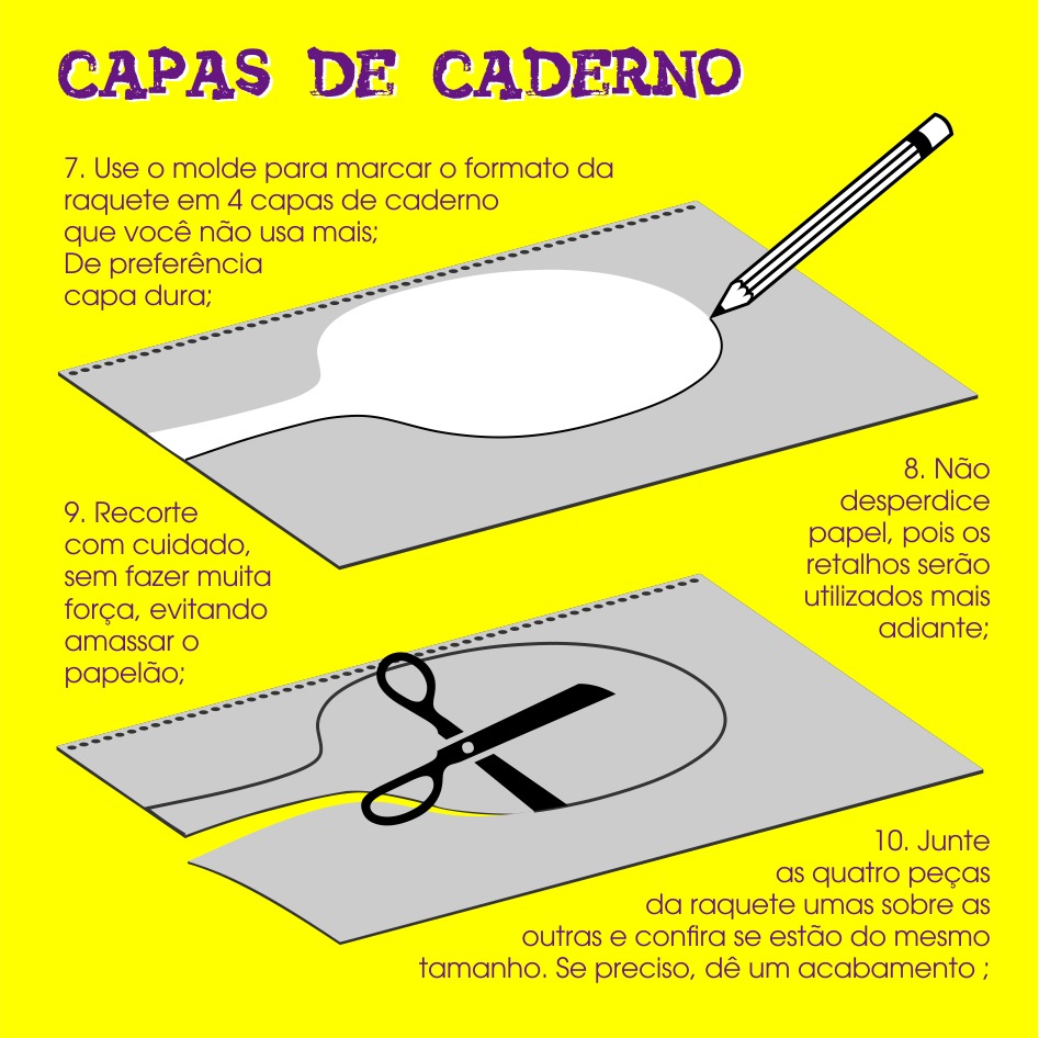 - Para as raquetes: Papel (molde), papelão, capa dura de cadernos e agendas inutilizados, cola bastão ou cola branca e cola quente.