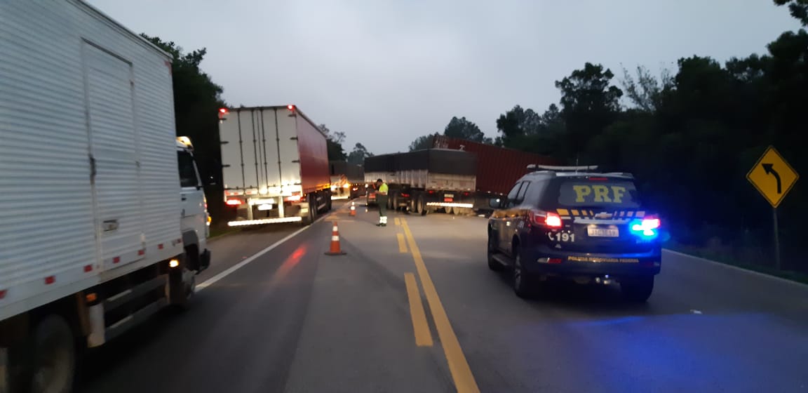 Um acidente envolvendo dois veículos de carga deixou lesões, na manhã desta terça (26), na BR 392, Km 82,8 sentido sul. Conforme Polícia Rodoviária Federal (PRF), a pista ficou parcialmente bloqueada para a retirada dos veículos.
