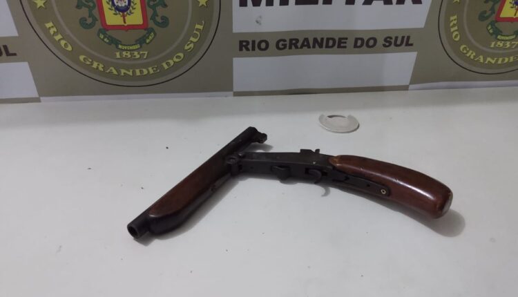 Ao chegar no local os policiais identificaram a vítima relatando ter sido agredida por seu companheiro e que este teria em sua posse uma arma de fogo calibre .28 com o cano serrado.