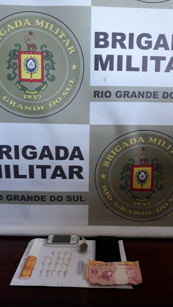 Autorizada a entrada à casa pela situação de flagrante a guarnição encontrou mais substâncias, dessa vez com características semelhantes à maconha, com indícios de que estariam embalando para venda. Durante revista pessoal foi localizado com uma mulher, mais quantidade de droga além de dinheiro fracionado.