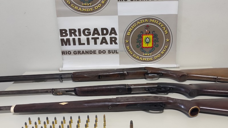 Durante busca veicular, foram localizadas uma espingarda Boito, calibre 12, uma espingarda CBC, calibre 28, um rifle CBC, calibre 22, 48 munições calibre 22 intactas e 01 munição calibre 38 intacta.