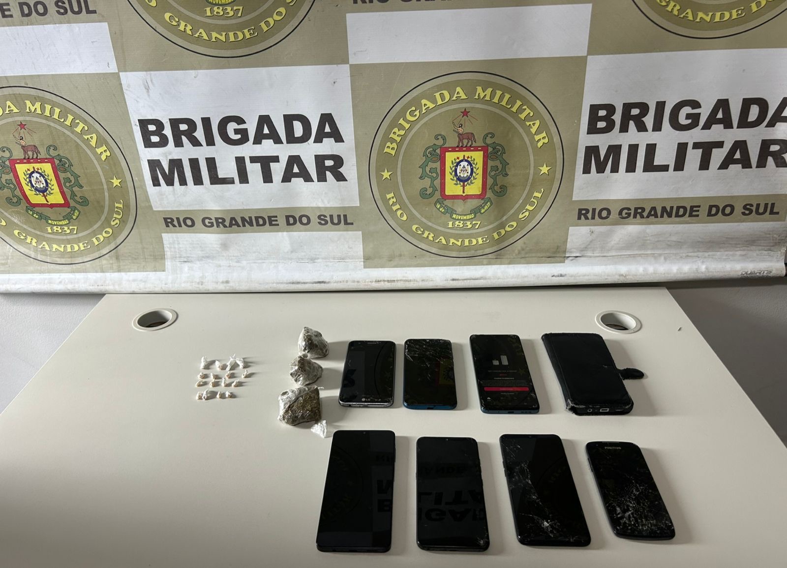 Durante a abordagem, os policiais localizaram com os suspeitos diversas substâncias ilícitas. Ao todo, foram apreendidas 16 porções de crack, 61 gramas de maconha e oito aparelhos celulares.
