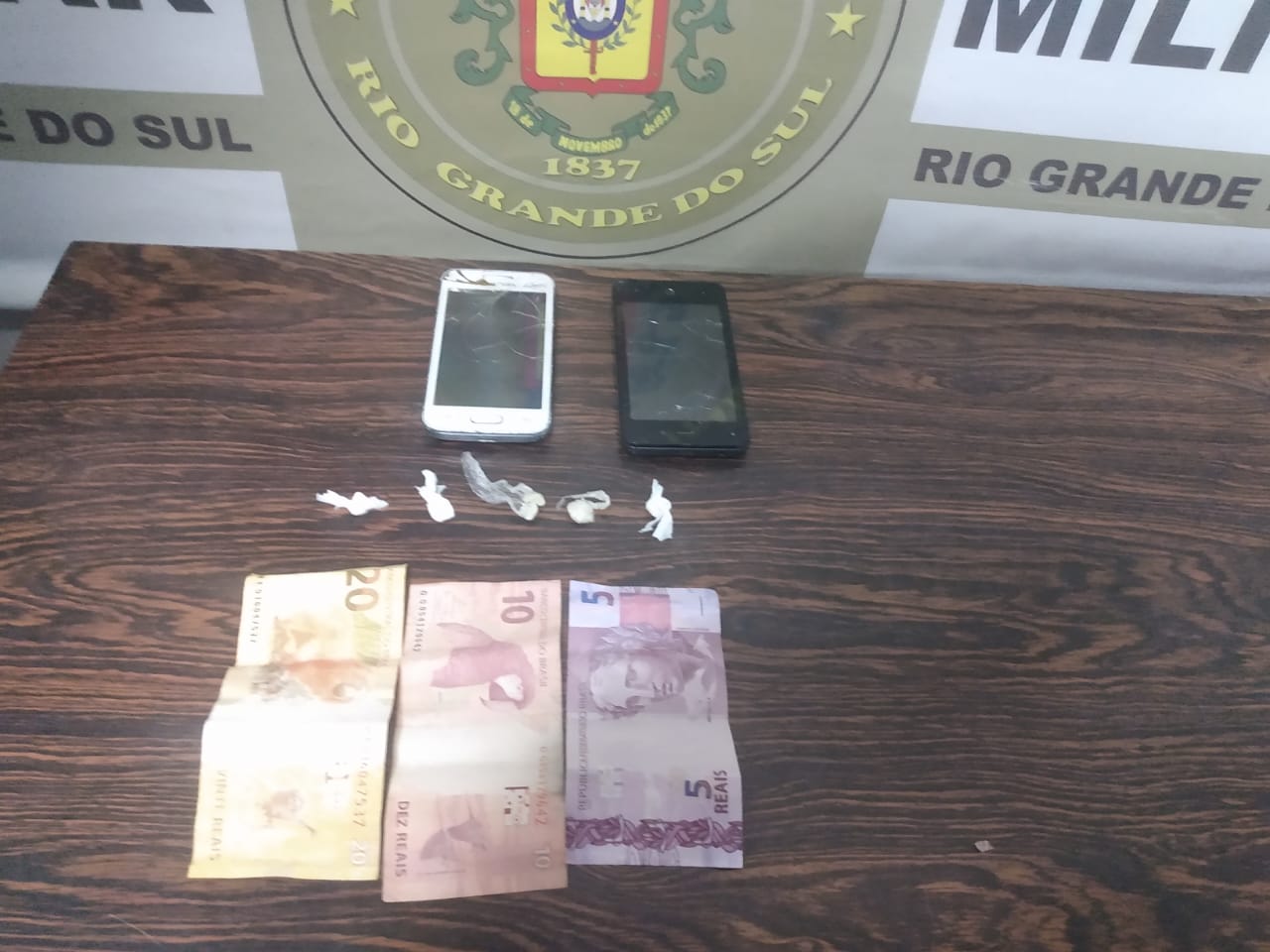 Após denúncia à sala de operações a guarnição deslocou até o local onde flagrou a autora sob posse de cinco invólucros de cocaína, dois celulares e trinta e cinco reais.