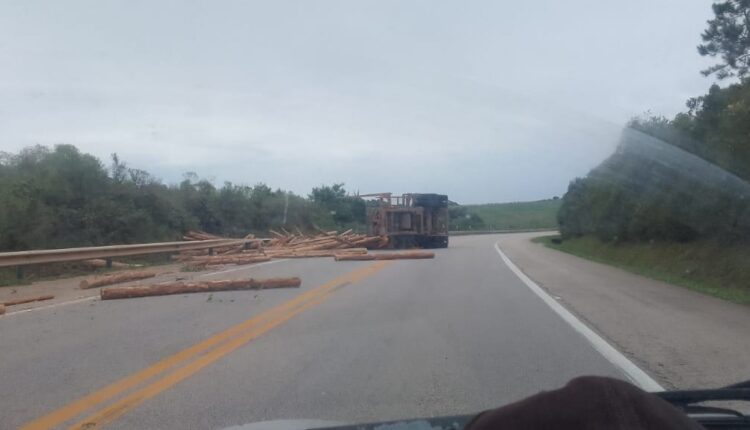 Carreta com troncos de madeira tomba na BR 392