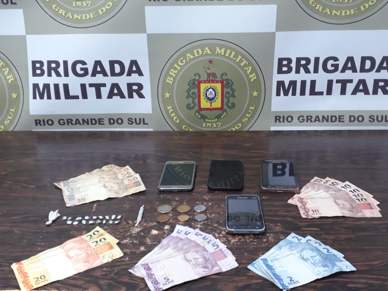Na sexta-feira (22), no Condomínio Bela Vista, em Canguçu, a Brigada Militar prendeu duas mulheres e apreendeu uma menor por tráfico de drogas ilícitas. Após denúncia à sala de operações, a guarnição se deslocou até o local e flagrou as suspeitas sob posse de 18 invólucros de crack, 1 invólucro de maconha, 4 aparelhos celulares e R$ 400 em dinheiro.