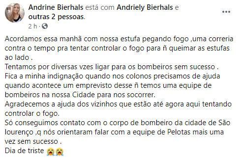 Segundo Andrine, sua família foi acordada na manhã desta quarta-feira (10) com a estufa sendo destruída pelo fogo que quase se alastrou também para outras estufas no entorno. Andrine descreveu em seu relato que a família tentou por diversas vezes ligar para o Corpo de Bombeiros de Pelotas, mas não conseguiu com que suas chamadas fossem atendidas.