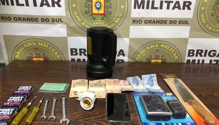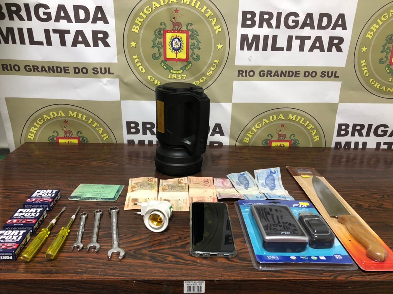 Na última quinta-feira (27), a Brigada Militar prendeu um homem por furto a estabelecimento comercial. Os policias encontraram o autor com um celular LG, três caixas epoxi, um facão, uma campainha eletrônica.
