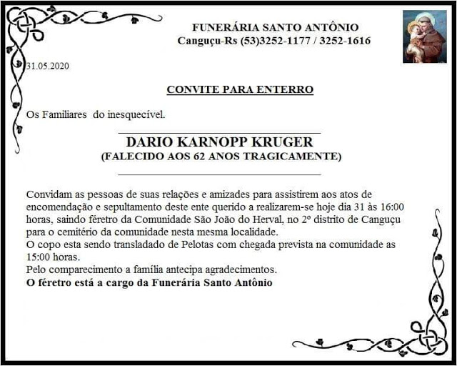 De acordo com o convite para enterro da Funerária Santo Antônio, a vítima foi velada na Igreja Independente do Herval, 2º Distrito e sepultada no cemitério da mesma comunidade ainda neste domingo, 31 de maio.