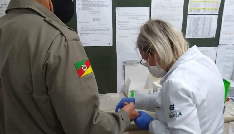 Integrantes da Brigada Militar de Canguçu realizam exames do Covid-19