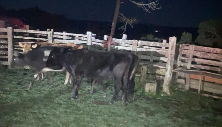Os policiais se deslocaram até o local e avistaram dois indivíduos que conseguiram fugir. Os agentes recuperaram uma vaca carneada, quatros animais vivos, uma arma de calibre 28 de fabricação artesanal e facas.