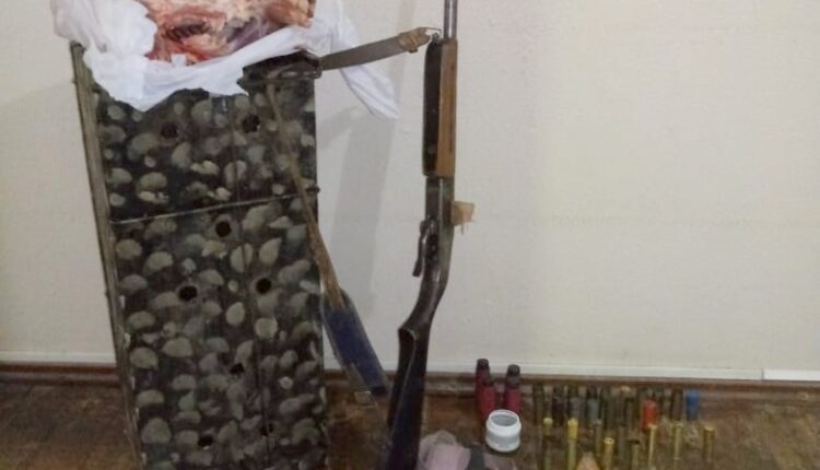 Ao realizar uma averiguação nas imediações foram encontrados uma arma Cal. 20 Magtech Model 199; 28 cartuchos deflagrados e prontos para uso cal. 20 e 12; 4 tubos de pólvora; 2 potes com espoletas; 3 potes com chumbo; 21 buchas de cartuchos; 1 socador de pólvora,ç; 3 facas; 1 celular; 1 animal silvestre carneado e uma armadilha.