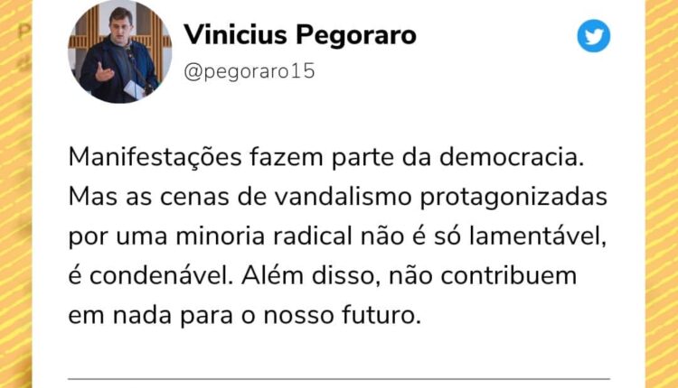 “Manifestações fazem parte da democracia. Mas as cenas de vandalismo protagonizadas por uma minoria radical não é só lamentável, é condenável. Além disso, não contribuem em nada para o nosso futuro”, disse Pegoraro.
