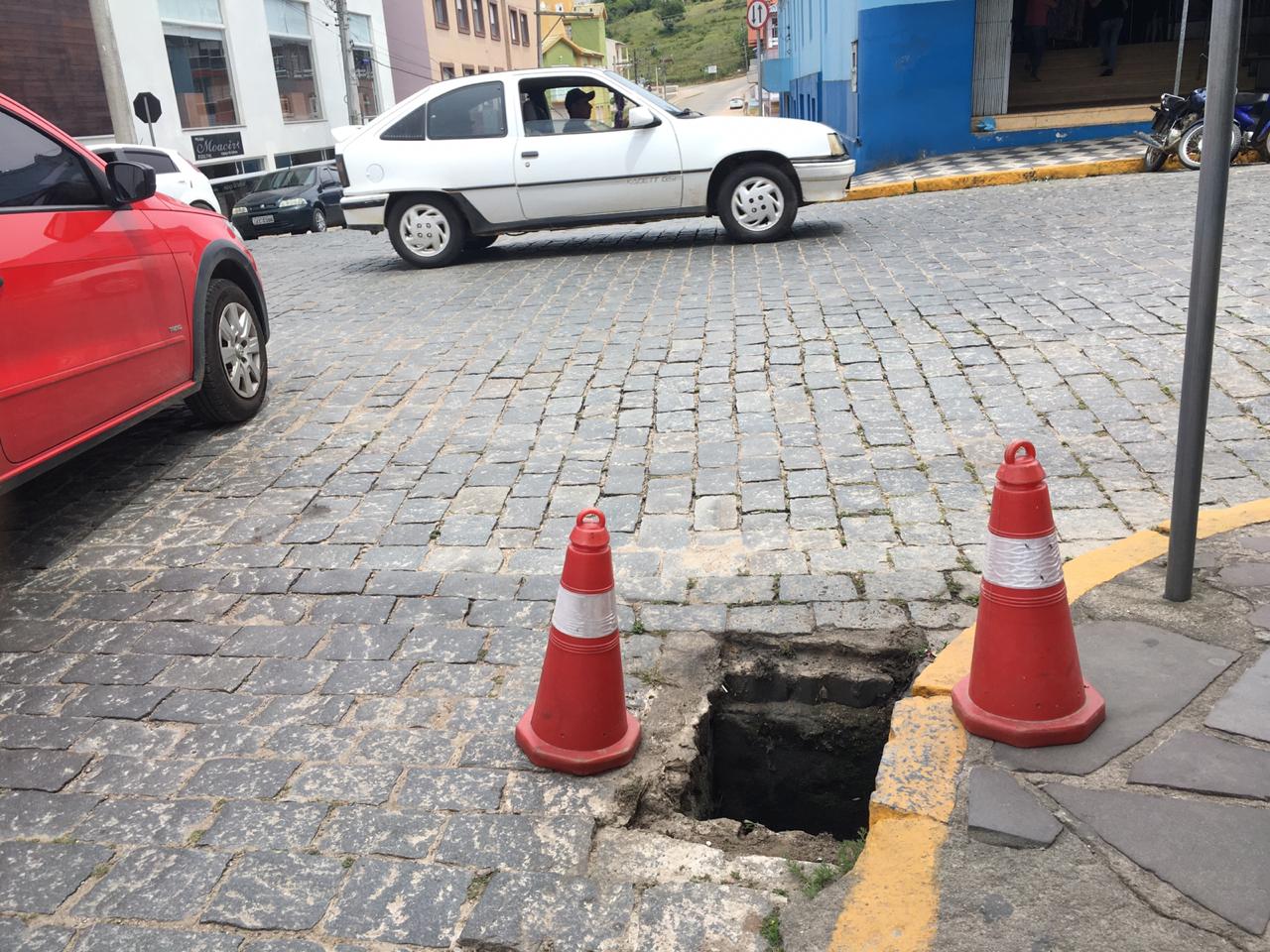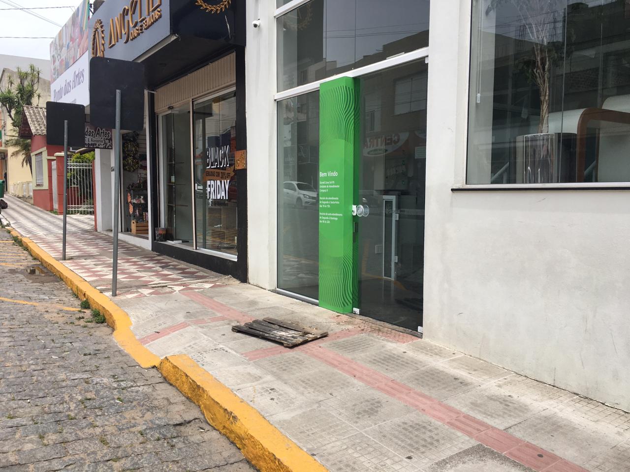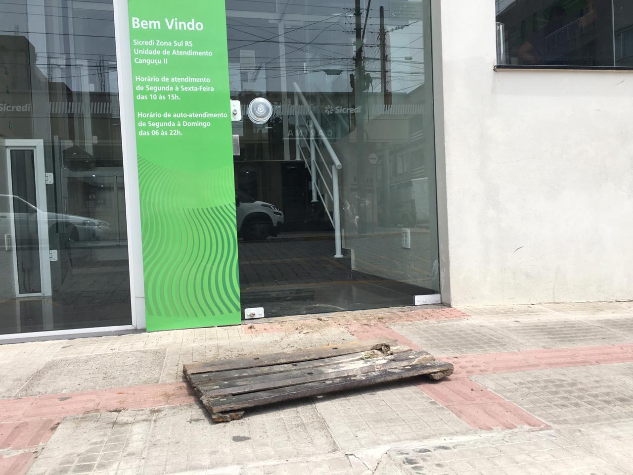 No cruzamento com a rua Osvaldo Aranha, uma tampa de bueiro foi arrancada e foi levada até a calçada em frente à Cooperativa Sicredi. O objeto pode ter sido usado para uma tentativa de entrada na agência.