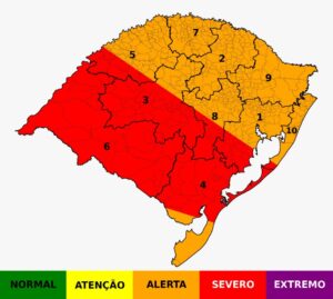 A previsão é de volumes bastante expressivos, por isso a condição é de alerta Vermelho – ou seja, muito alto – nas áreas mais a Oeste e do Centro até o Sudeste do Estado. Os maiores volumes, que irão variar de 200 a 300 mm, se concentrarão mais a Oeste.