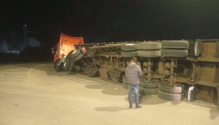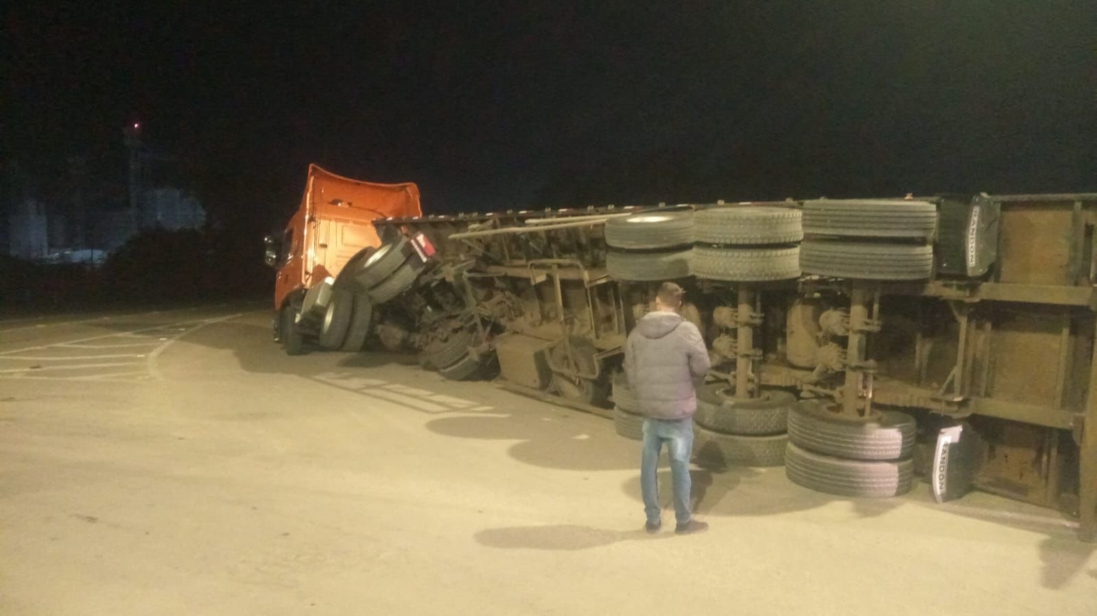 Uma carreta tombou por volta das 23h05 desta segunda-feira (4), no km 530 da BR-116, em Pelotas. Apesar do susto, o motorista saiu ileso.