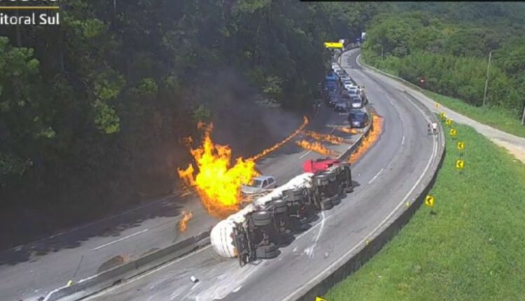 Explosão após tombamento de caminhão-tanque deixa cinco feridos e interdita BR-101 em Palhoça/SC