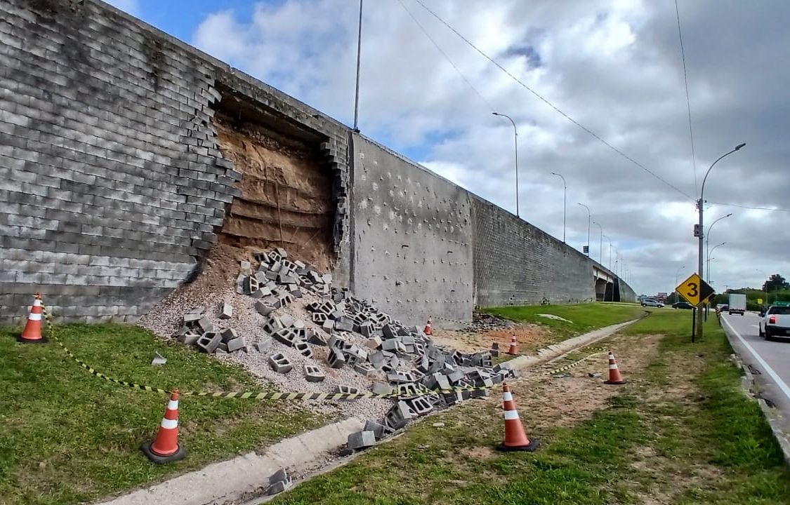 Por volta de 1h30 desta quinta-feira (27), a BR-116 precisou ser totalmente bloqueada no km 521, sentido norte, em Pelotas, após parte do viaduto da Avenida 25 de Julho ceder. O incidente exigiu a interrupção imediata do tráfego na pista principal para garantir a segurança dos usuários da rodovia.