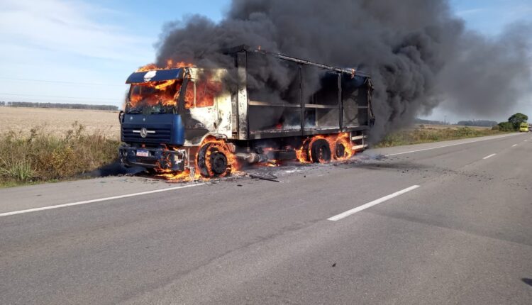 Pista é bloqueada por incêndio em caminhão na BR-116, em Pelotas