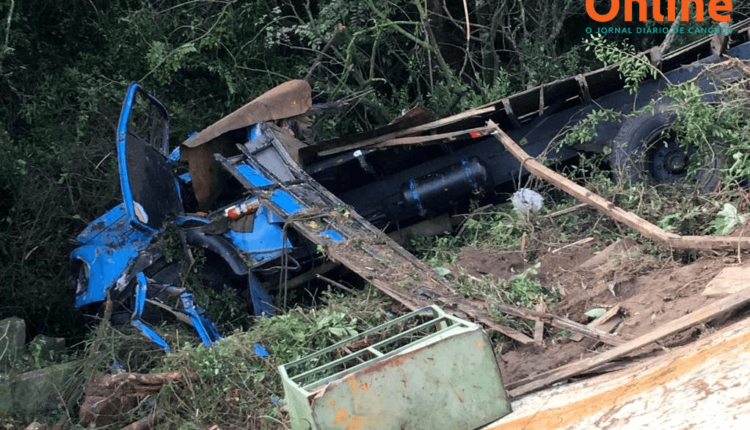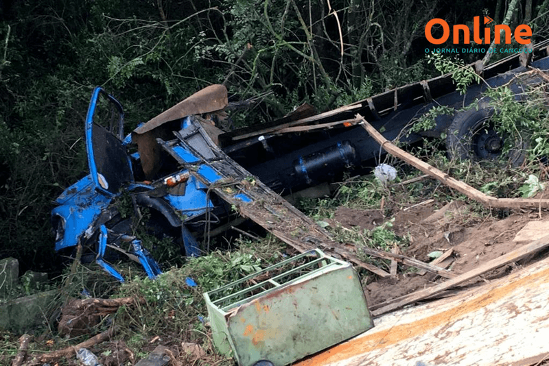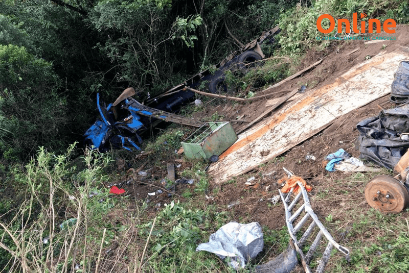 Um caminhão Mercedes que transportava sucatas e uma motocicleta saiu da pista na noite de sexta-feira (14) e caiu em um barranco na Curva da Morte, na BR-392.