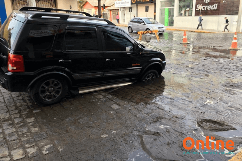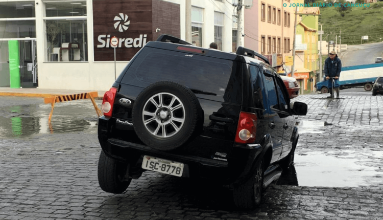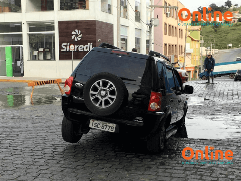 A Ford Ecosport caiu na cratera e precisou da ajuda de uma retroescavadeira para ser retirada. Segundo comerciantes da região, é comum um bueiro entupir naquela esquina e gerar transtornos.