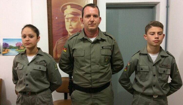 soldado Rodrigo Miranda e os Soldados Mirins Nunes e Becker. Rodrigo está na dianteira do projeto Brigada Mirim, que é oferecido a crianças do município.